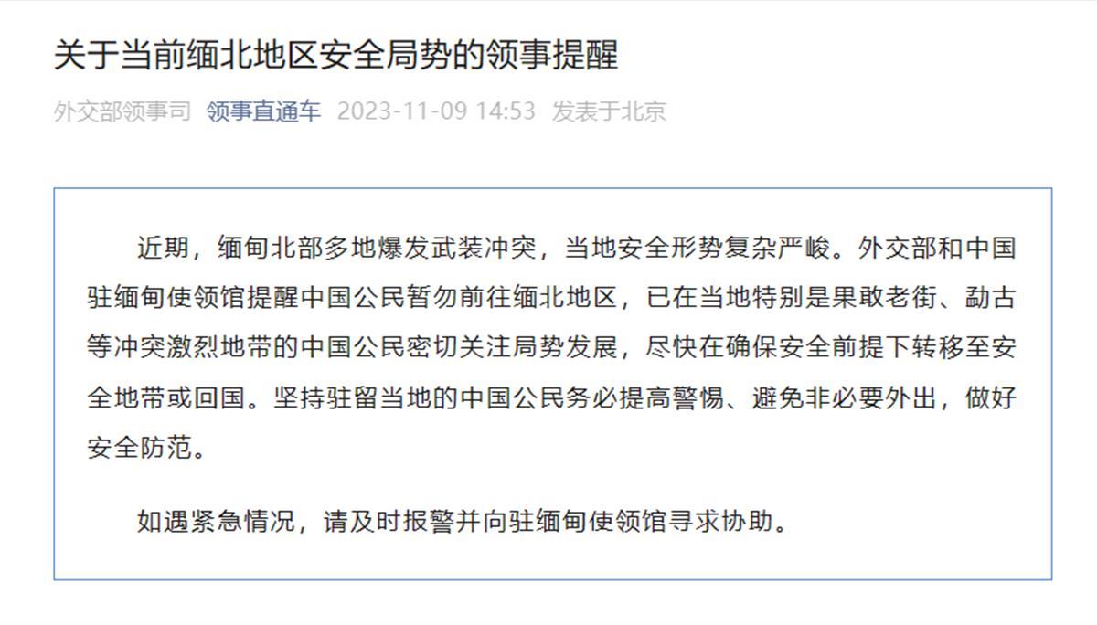 此前,中國外交部領事司通過其微信公眾號“領事直通車”發布《關于當前緬北地區安全局勢的領事提醒》稱,近期,緬甸北部多地爆發武裝沖突,當地安全形勢復雜嚴峻。外交部和中國駐緬甸使領館提醒中國公民暫勿前往緬北地區,已在當地特別是果敢老街、勐古等沖突激烈地帶的中國公民密切關注局勢發展,盡快在確保安全前提下轉移至安全地帶或回國。堅持駐留當地的中國公民務必提高警惕、避免非必要外出,做好安全防范。如遇緊急情況,請及時報警并向駐緬甸使領館尋求協助。