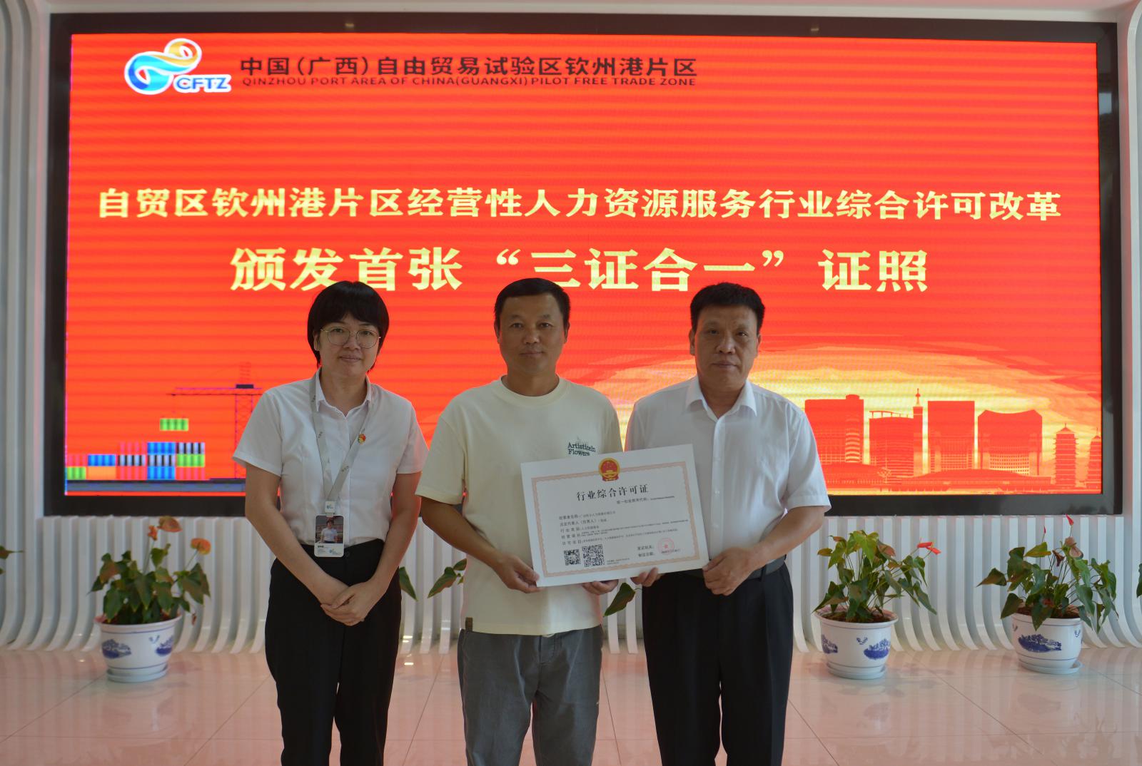 7月20日,中國(廣西)自由貿(mào)易試驗(yàn)區(qū)欽州港片區(qū)(以下簡稱欽州港片區(qū))行政審批局為廣西乾豐人力資源有限公司發(fā)出了欽州市首張“三證合一”的人力資源服務(wù)行業(yè)綜合許可證,人力資源服務(wù)企業(yè)辦事成本得到進(jìn)一步壓縮。