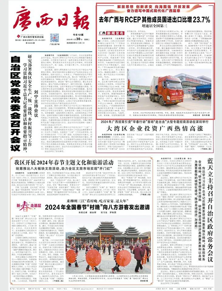 據介紹,RCEP生效兩年來,全區累計培育12家企業取得經核準出口商資格,申領原產地證書和聲明出口企業190家。加快RCEP其他成員國優質農食產品檢疫準入進程,推動柬埔寨椰子、老撾芒果、泰國西番蓮等15種農食產品實現輸華準入。雙向投資進一步擴大。截至2023年底,廣西吸引RCEP其他成員國外資企業1059家,實際投資額21.3億美元;廣西備案或核準對RCEP其他成員國(非金融類)投資企業及機構累計496家,協議投資總額110.9億美元。與越南、文萊、柬埔寨、老撾等國家簽署系列備忘錄、合作協議。